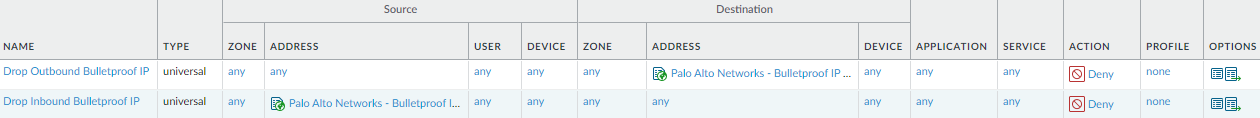 - Set the external dynamic list Palo Alto Networks - Bulletproof IP addresses as the Destination address for the outbound traffic rule, and as the Source address for the inbound traffic rule.