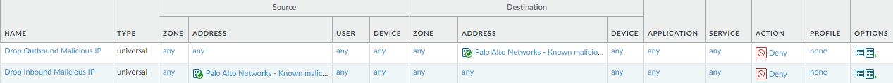 Block and log traffic to and from high-risk IP addresses from trusted threat advisories.Why Do I Need These Rules? Rule Highlights Although Palo Alto Networks has no direct evidence of the maliciousness of the IP addresses in the high-risk IP address feed, threat advisories have linked them to malicious behavior.- Block and log the traffic as shown in this example.