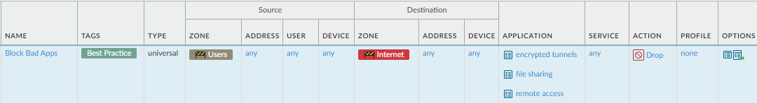 Application block rules protect you from evasive and commonly exploited applications while you develop and tune your Security policy rulebase. Temporary tuning rules help find gaps in policy and identify possible attacks. Because they catch application traffic you didn't know was running on your network, they allow traffic that could pose security risks. The following block rules explicitly block potentially malicious applications and protocols that attackers commonly use, such as public DNS and SMTP, encrypted tunnels, remote access, and non-sanctioned file-sharing applications.