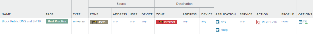 • Because the temporary tuning rules might allow traffic with malicious intent as well as legitimate traffic that doesn't match your policy rules as expected, they could allow risky or malicious traffic. This rule blocks traffic that has no legitimate use case and that an attacker or a negligent user could use.