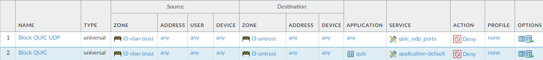 The first rule specifies the Service you configured for QUIC and the second rule blocks the QUIC application: