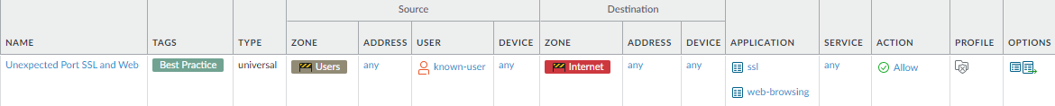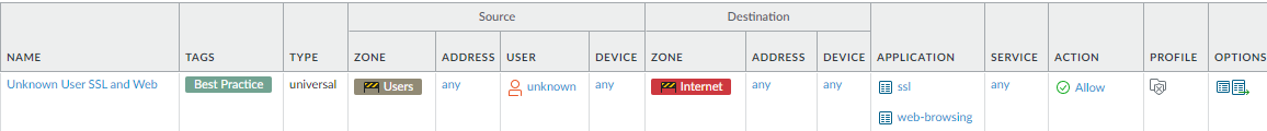 • While the majority of the application allow rules apply to known users or specific user groups, this rule explicitly matches traffic from unknown users.