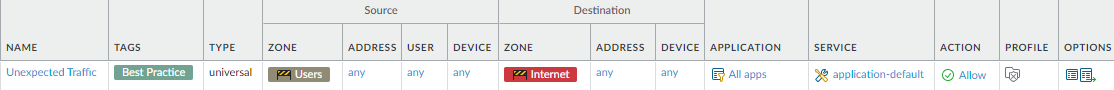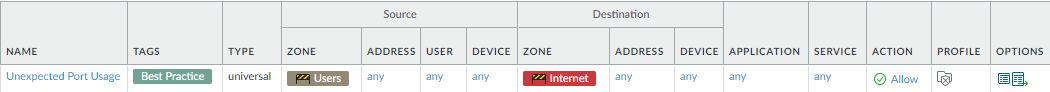 • Unlike allow rules that allow applications only on the default port, this rule allows web-browsing and SSL traffic on any port to find gaps in your allow list.