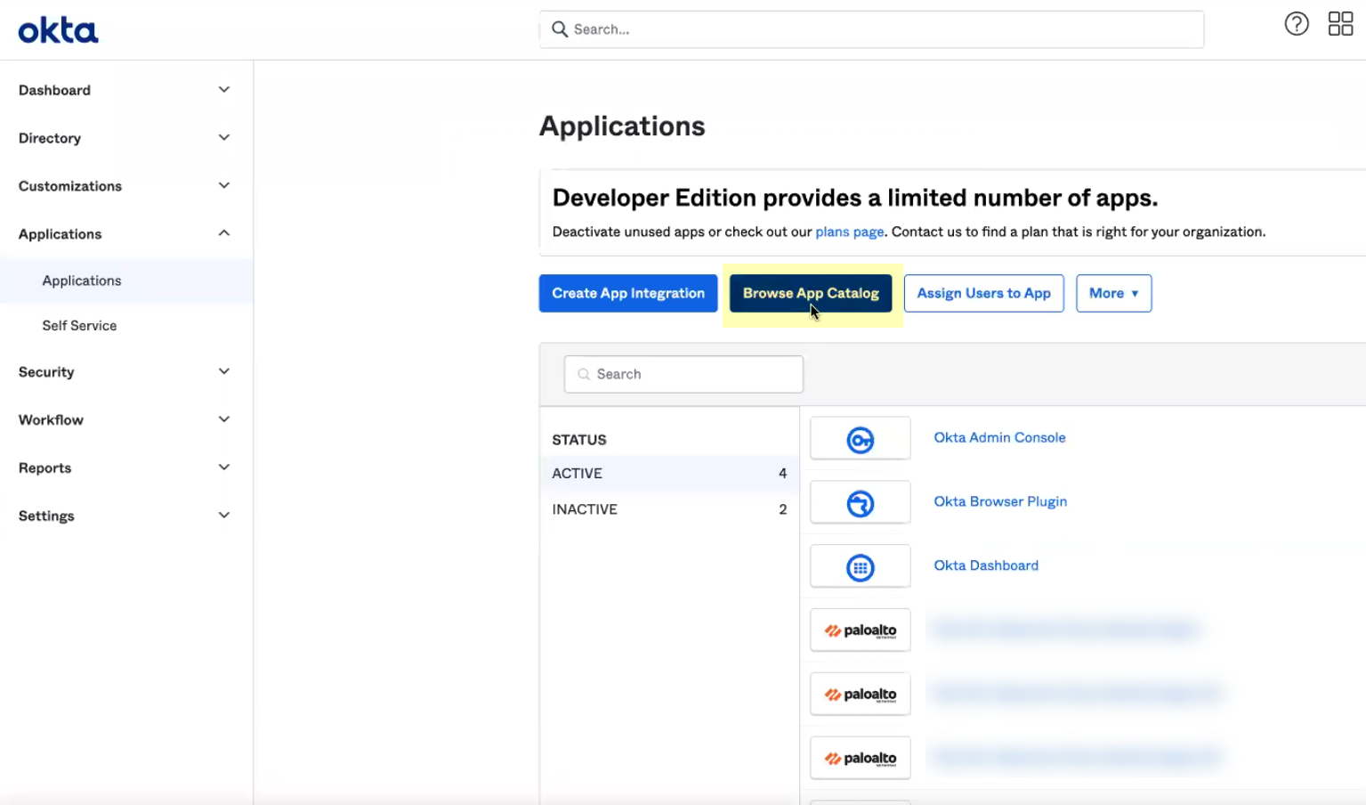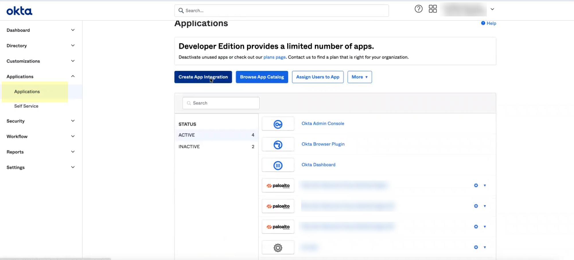 In the Okta Admin Console, select ApplicationsAPI Service Integrations and select the Palo Alto Networks