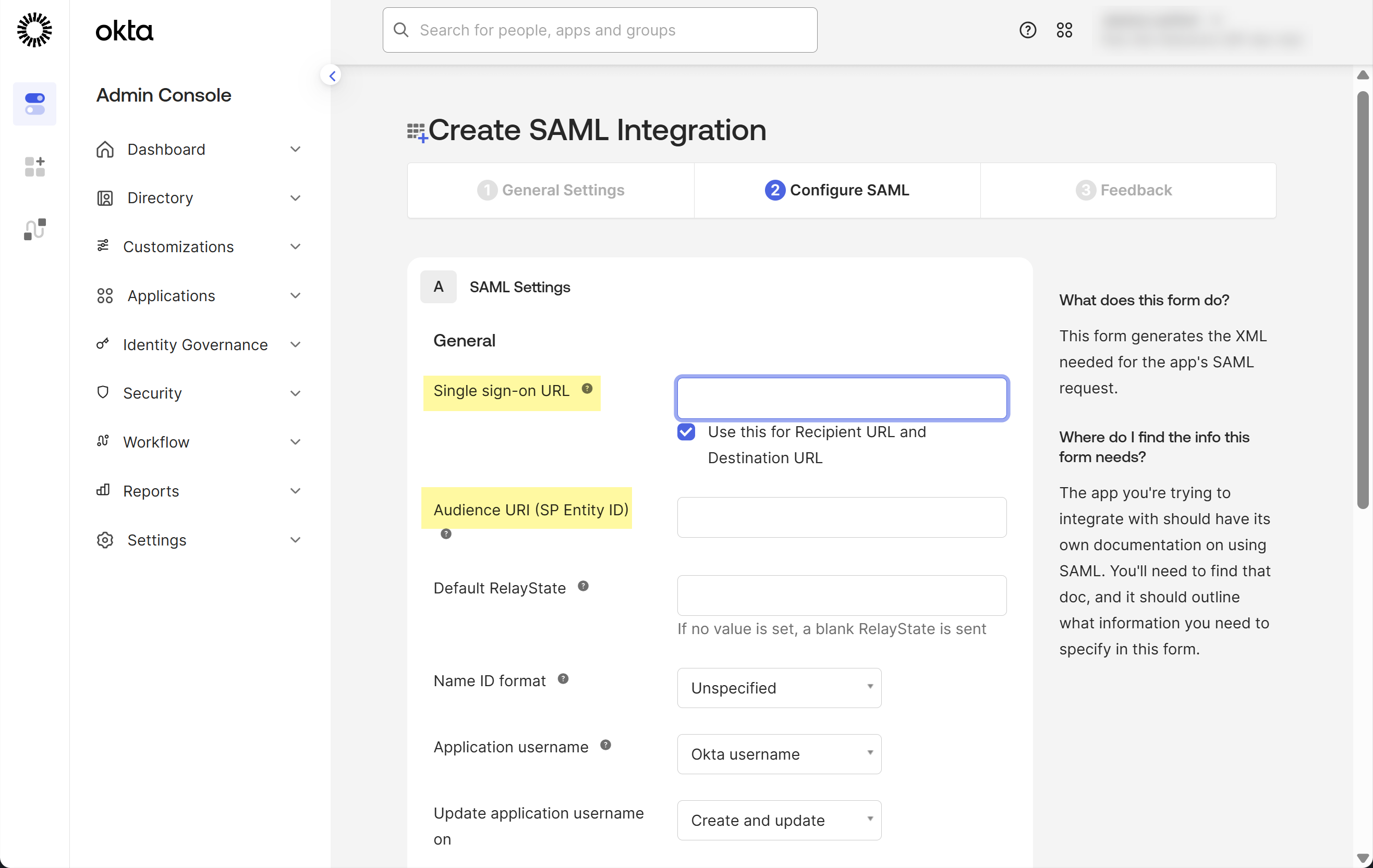 Enter in Okta Admin Console