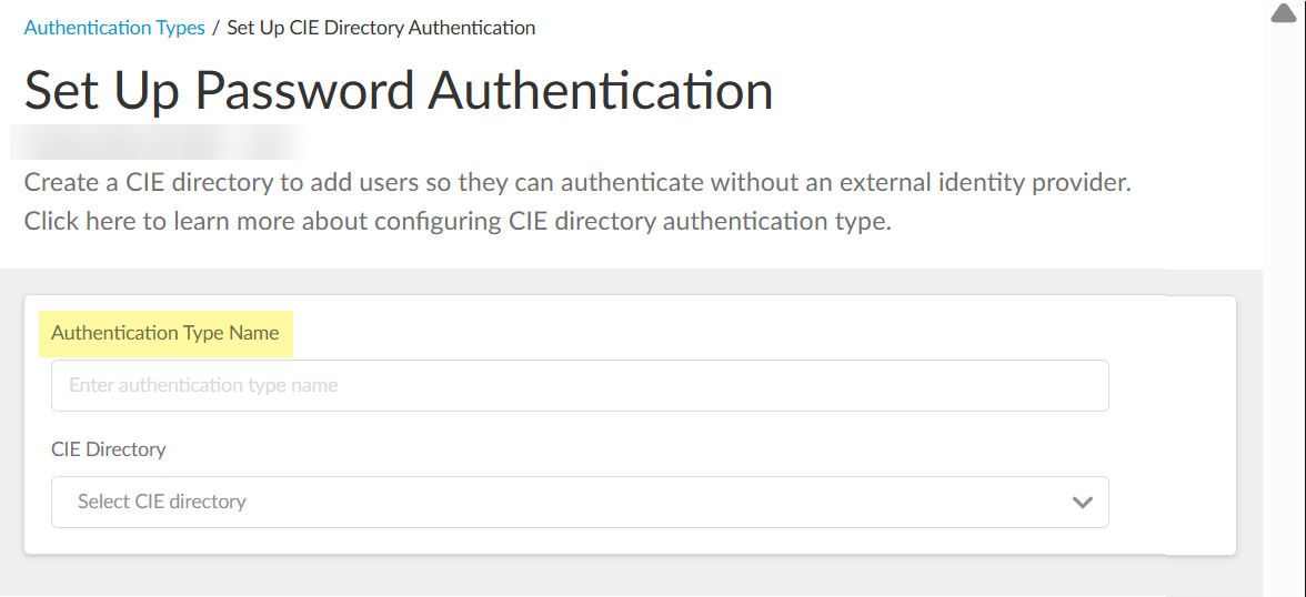 Configuring password authentication as an authentication type enables CIE directory users to authenticate without requiring the use of an external IdP. After you configure password authentication for your CIE directory, you can select password authentication as an authentication type in an authentication profile. This enables CIE directory users to authenticate using passwords, instead of having to configure an additional identity provider.