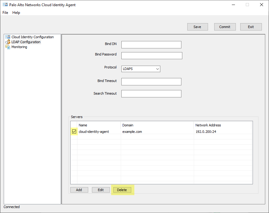 - Launch the agent and select LDAP Configuration.From the list of Servers, select the domain you want to delete and Delete it.