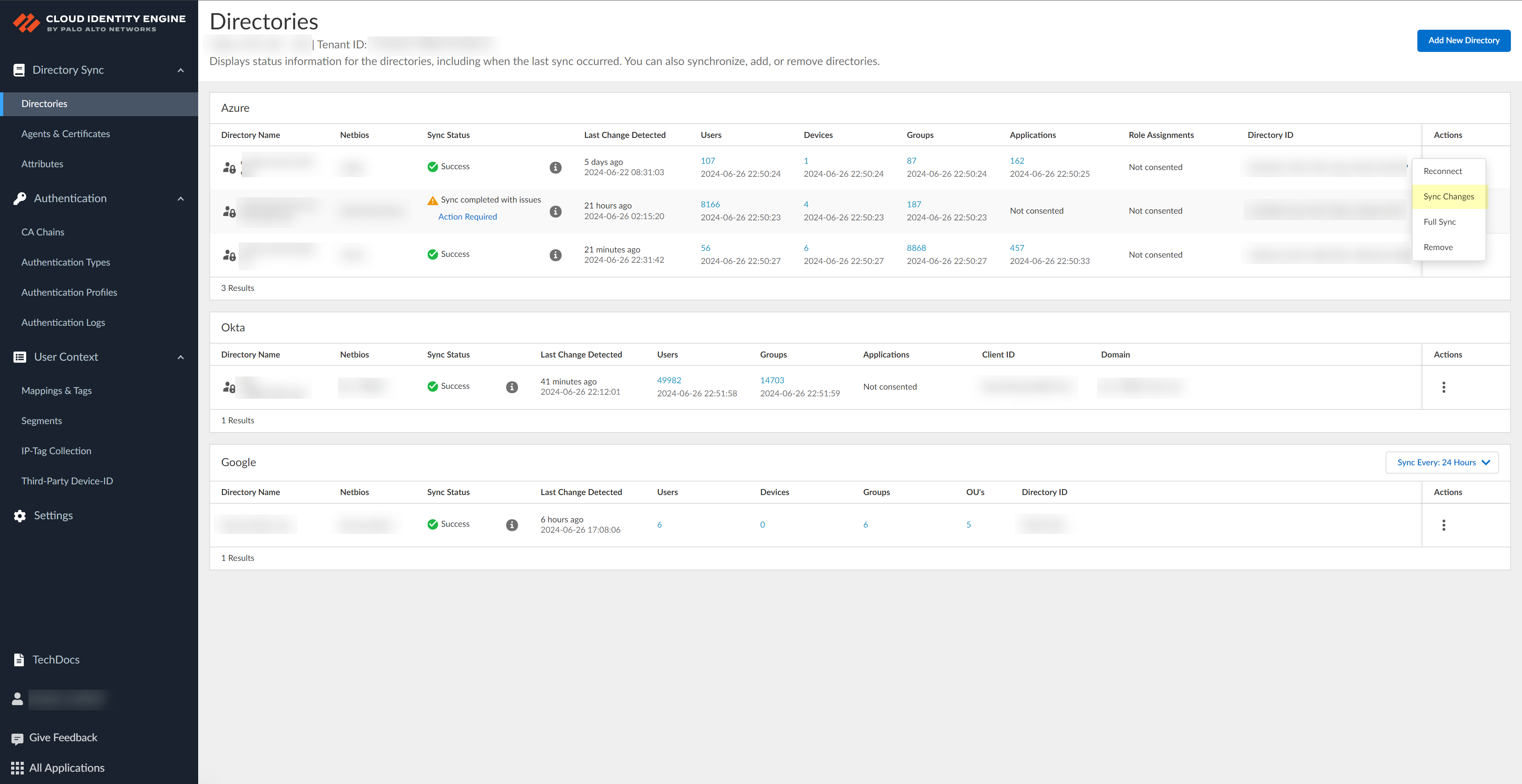 You can sync just the changes to your directory, which is much faster than a full sync of your directory. By default, the Cloud Identity Engine syncs changes for most attributes every five minutes unless a sync is already in progress.The Sync Status on the Directories page may incorrectly indicate Success while an incremental sync is still in progress. The synchronization automatically captures any changes made in the directory but it is not possible to initiate another sync while a sync is currently in progress.For Azure Active Directory (Azure AD) and Okta, the Cloud Identity Engine syncs attributes for users and groups every five minutes; for Azure AD, a sync for devices occurs daily if the previous device sync required less than 24 hours to complete. If completing the device sync required more than 24 hours, the next sync occurs at the interval of the duration for the previous device sync (for example, if the previous device sync required 26 hours, then the next sync would occur 26 hours from the previous successful sync).The Sync Changes option is not available for Google Directory.- If you have not already done so, configure a directory.After making changes to your directory, select ActionsSync Changes to sync the changes for your directory.