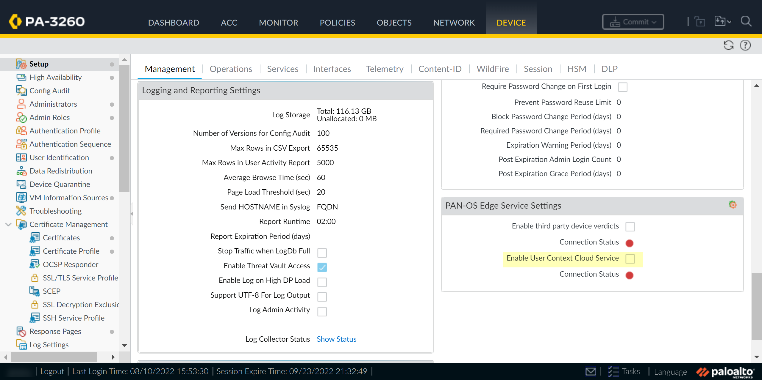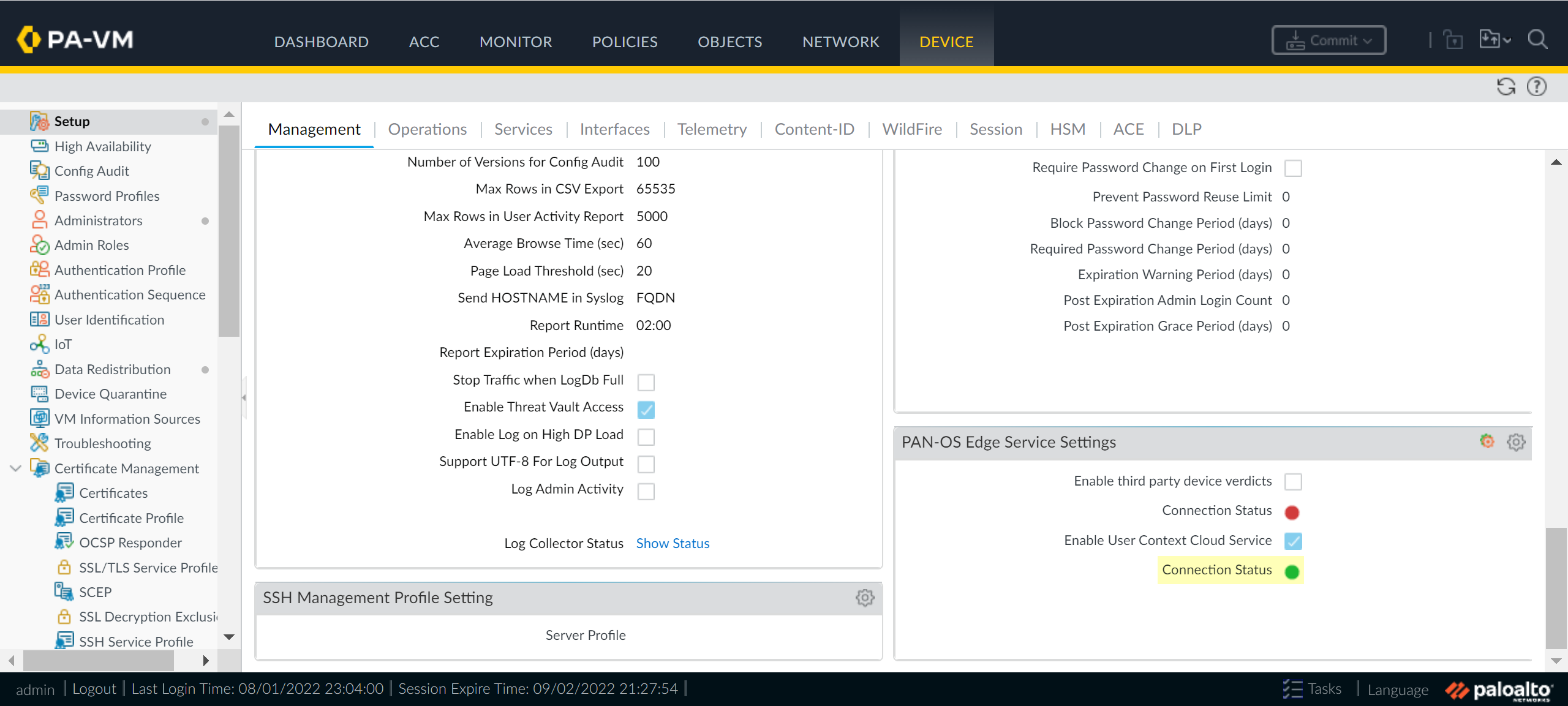When your configuration is complete, Review Changes and Save the configuration.On your firewall, enable the service that the Cloud Identity Engine uses to communicate with your firewall.- Ensure that you have configured a device certificate.Log in to the firewall and Edit the PAN-OS Edge Service Settings (DeviceManagementSetupPAN-OS Edge Service Settings).