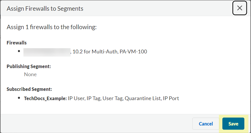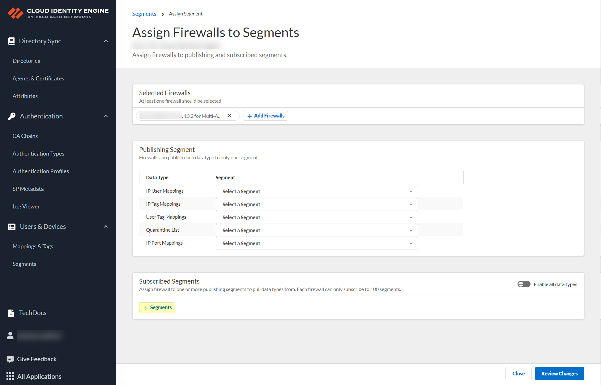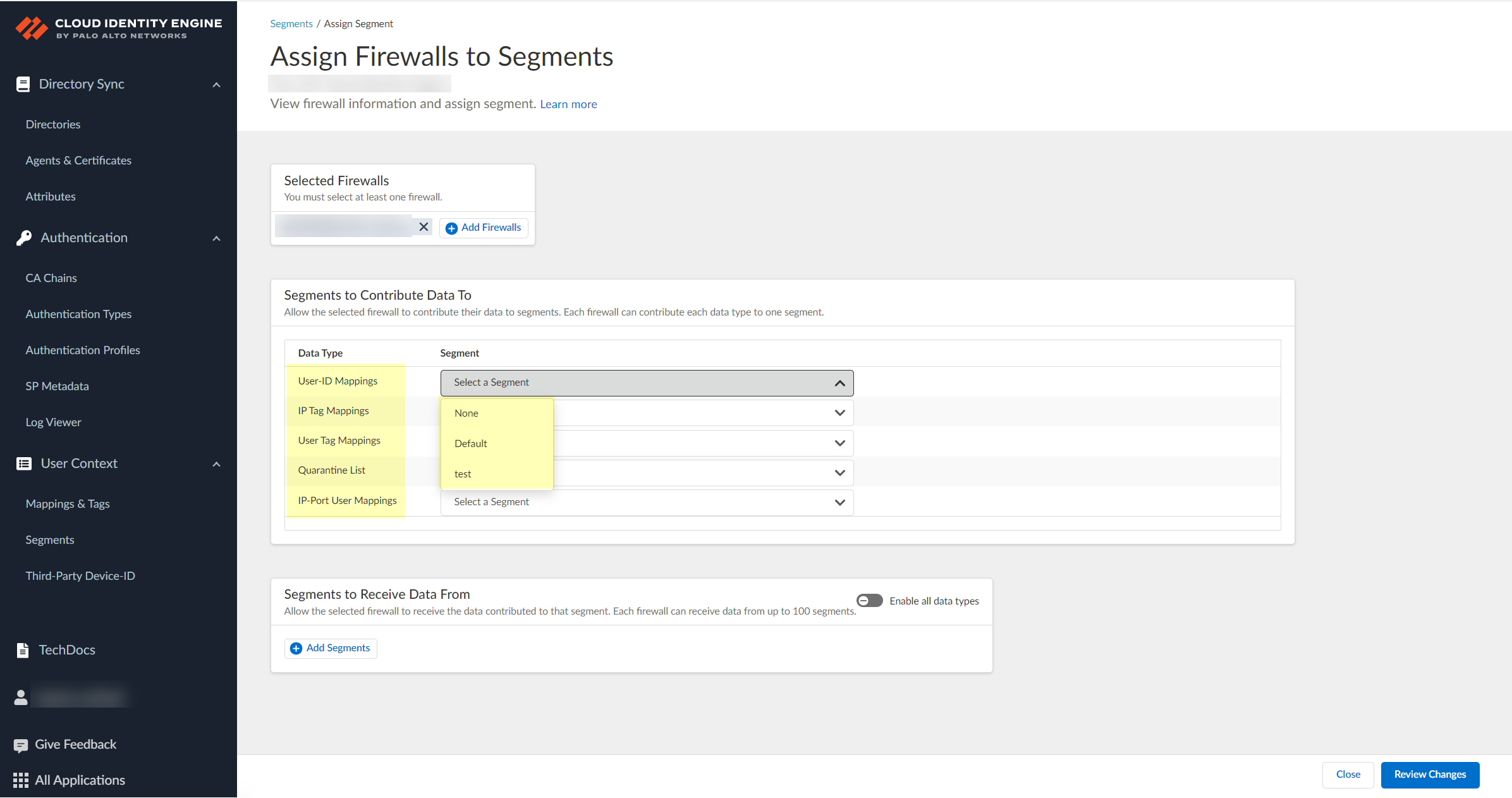 After selecting the firewalls that you want to include in this segment, Assign Segments to the selected firewalls.Assigning a segment to a firewall allows you to define which data the Cloud Identity Engine receives from or provides to that firewall. You can only assign segments to a firewall that uses PAN-OS 11.0; User Context does not support other source types.