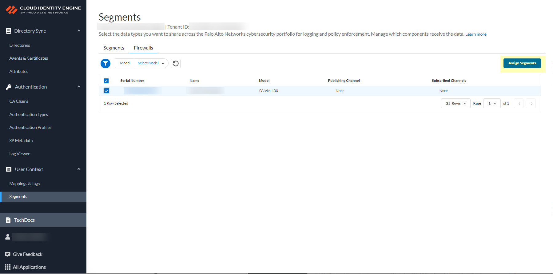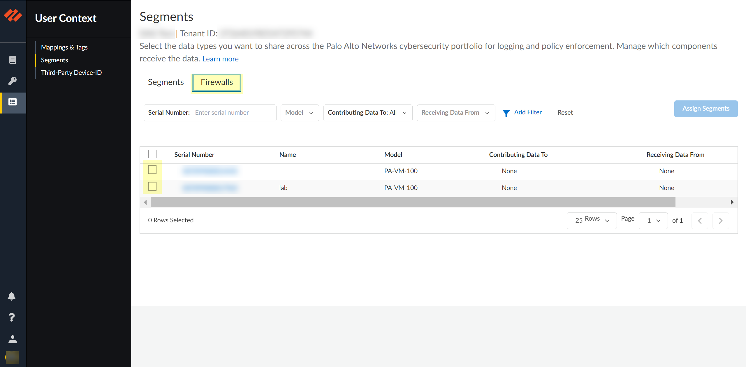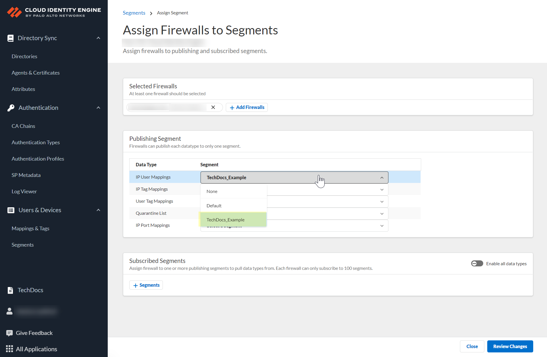 After selecting the firewalls that you want to include in this segment, Assign Segments to the selected firewalls.Assigning a segment to a firewall allows you to define which data the Cloud Identity Engine receives from or provides to that firewall. You can only assign segments to a firewall that uses PAN-OS 11.0; User Context does not support other source types.
