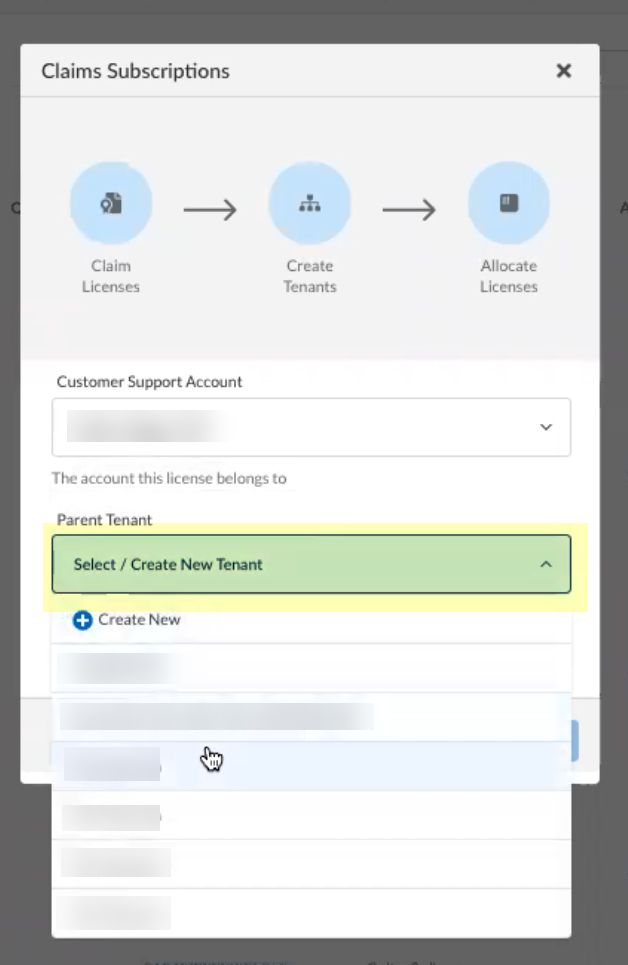 Select the Parent Tenant you want to use or click Create New to create a new tenant.