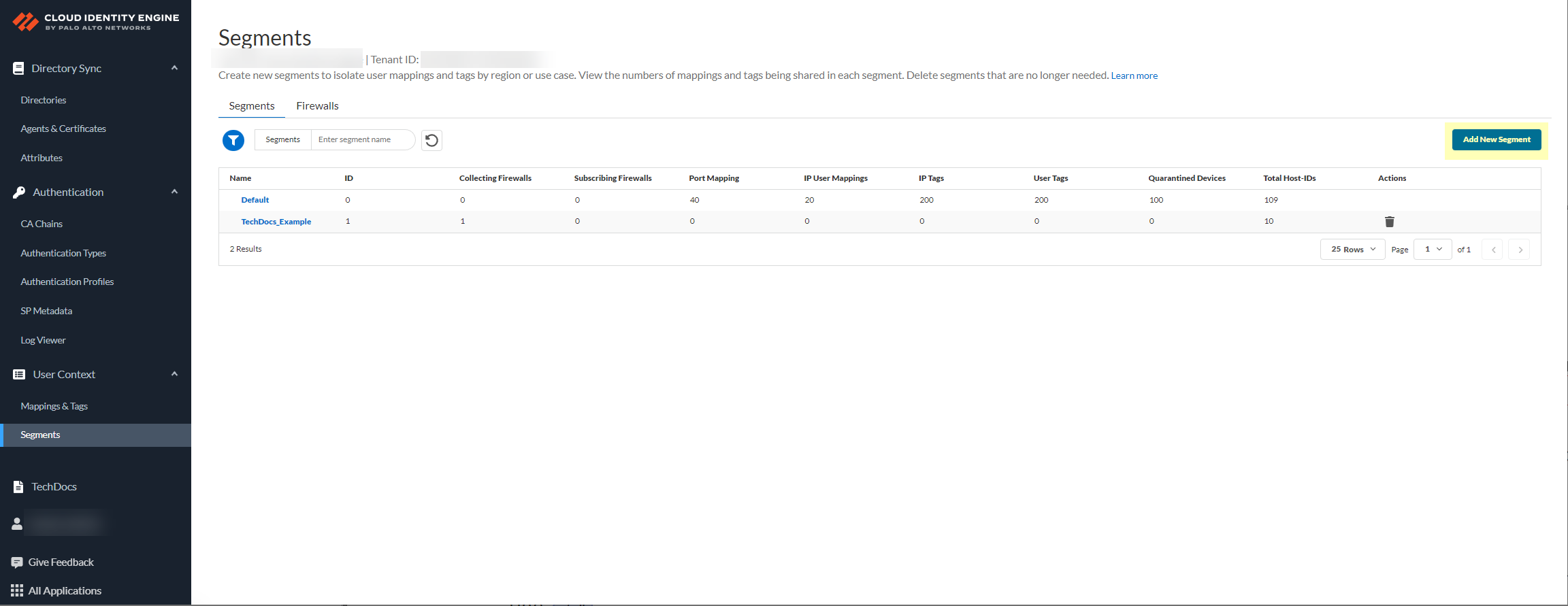 Create a segment to subscribe to the publishing segment you created in the previous step.Publishing segments provide the specified data type that the Cloud Identity Engine collects from other firewalls to the segment containing the firewalls that you select.You can subscribe up to 100 segments per firewall.- Select User ContextSegments and click Add New Segment.