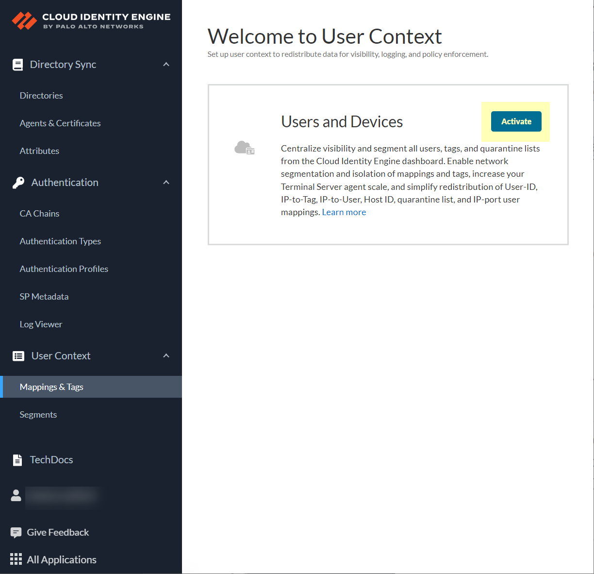 In the Cloud Identity Engine, activate sharing for mappings.- Log in to the Cloud Identity Engine app and select User ContextSegmentsActivate sharing for mappings.