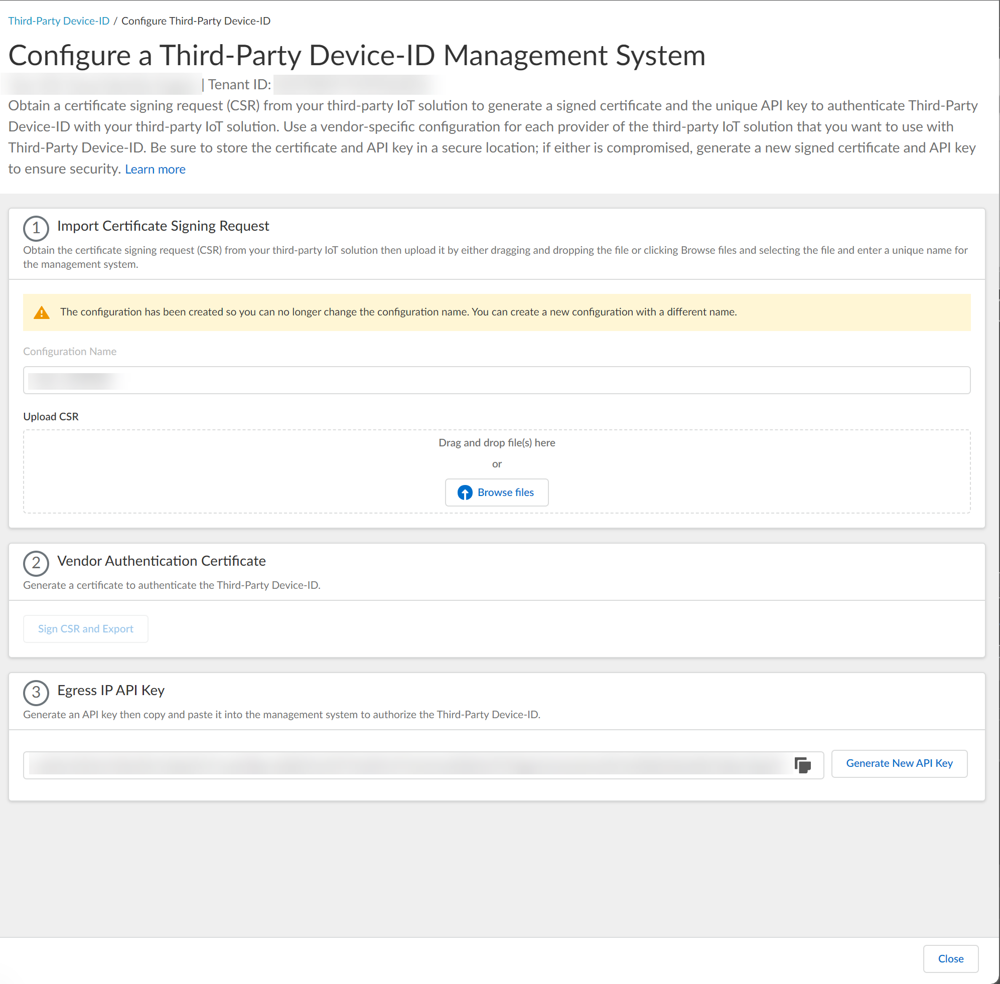 Copy the API key then import both the signed certificate that you downloaded and the API key that you generated to the management system for your third-party IoT solution and configure the IoT solution to use these files to communicate with the Third-Party Device-ID.To ensure that the third-party IoT solution can successfully communicate with the Third-Party Device-ID, you must upload both the signed certificate from the previous step and the API key. Create a configuration for each third-party vendor in your network that you want to use with Third-Party Device-ID. The configuration for each vendor must have a unique signed certificate and API key; don't use the same certificate or API key in more than one configuration.