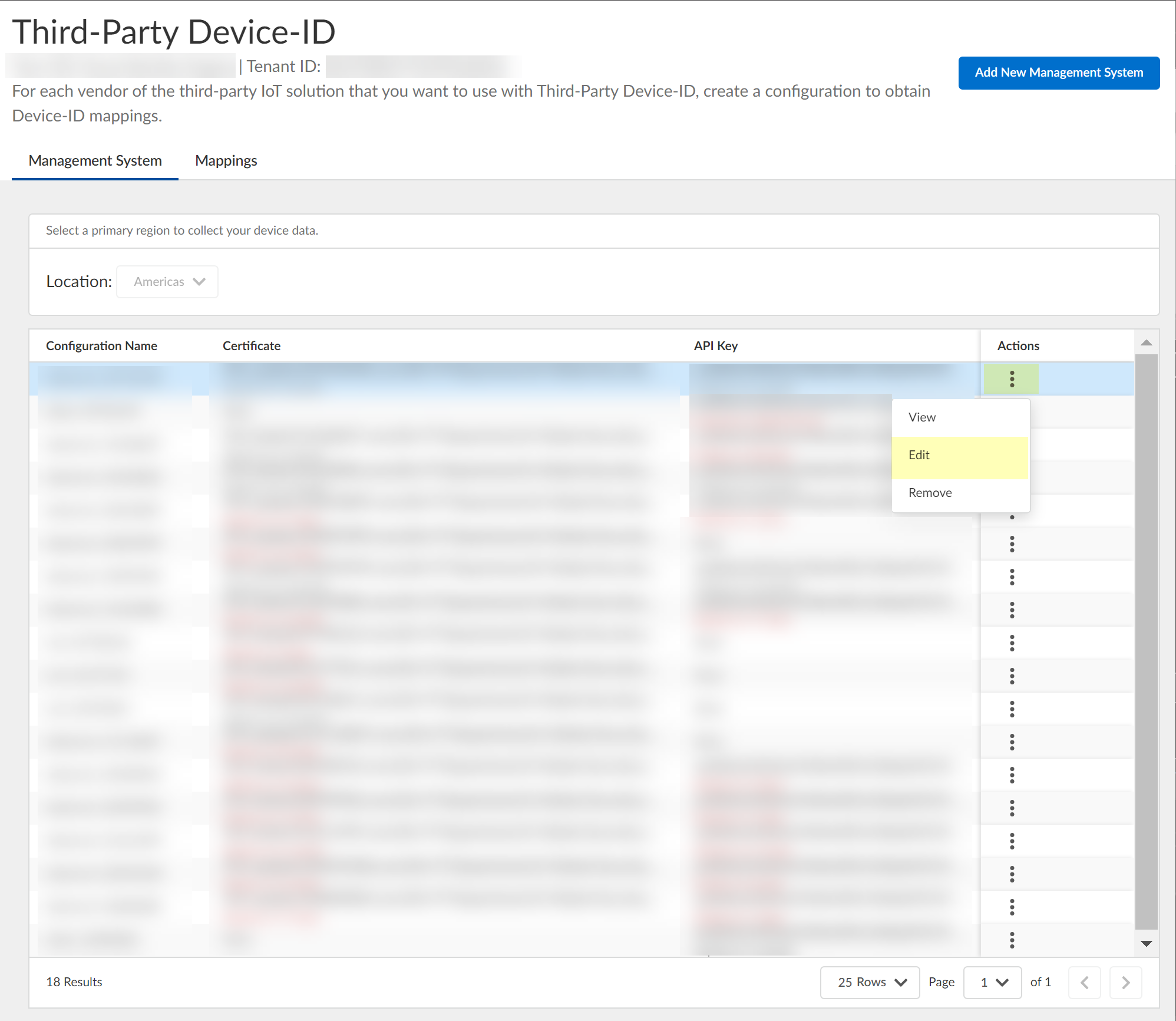 Select Management Systems to view information about your management systems, such as certificate expiration date and API key.(Optional) Edit the management system configuration.- In the row for the management system you want to edit, select ActionsEdit.