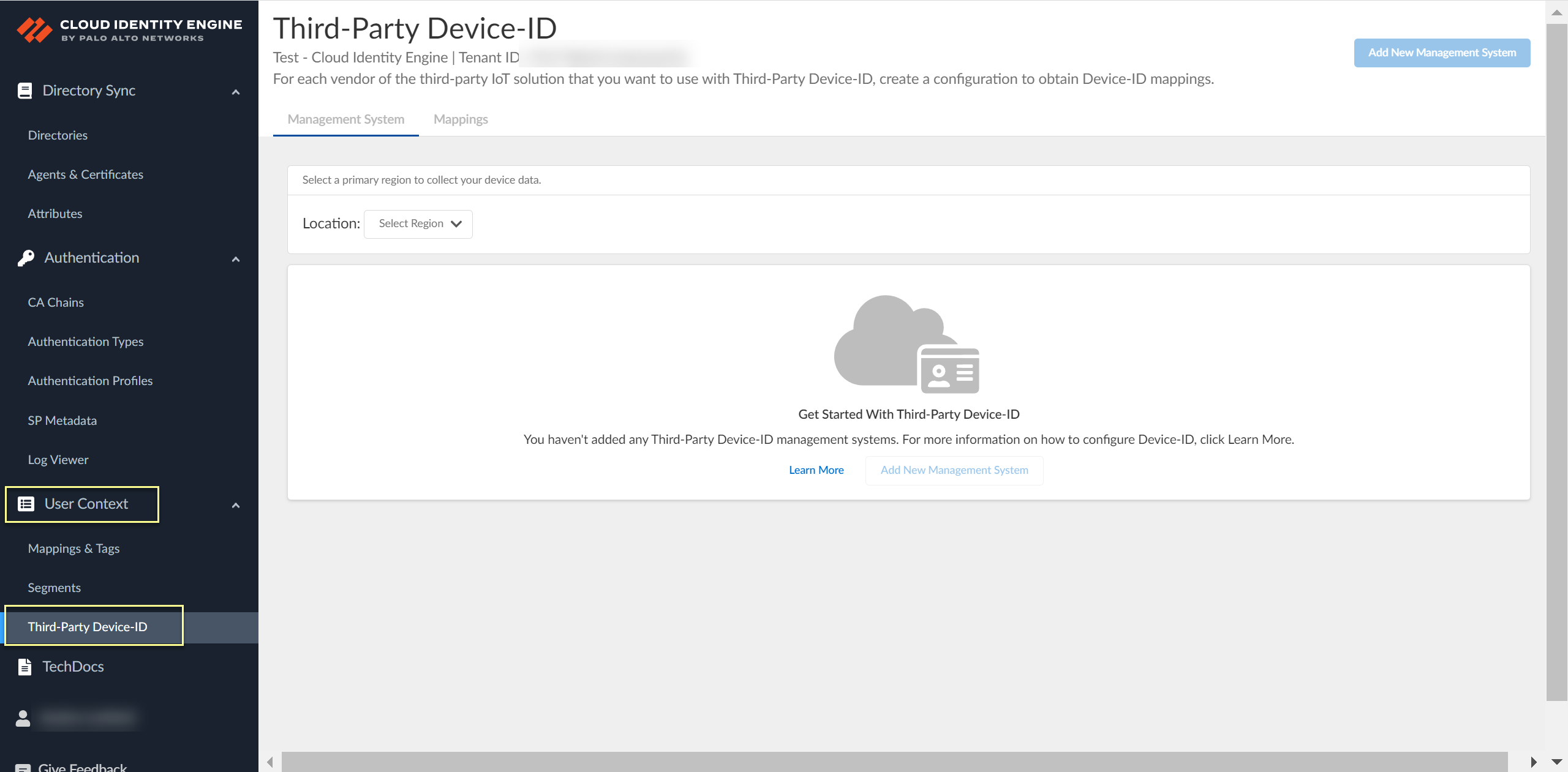 - Log in to the hub and select the Cloud Identity Engine tenant you want to use, then select User ContextThird-Party Device-ID.