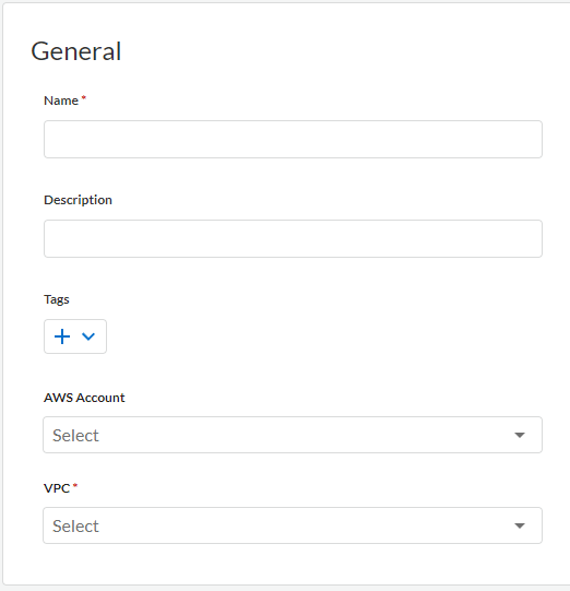 - Select NGFWs.Click Add Firewall.Enter a descriptive Name.(Optional) Enter a Description.Select an AWS Account from the drop-down to associate with this NGFW.Select a VPC from the drop-down.