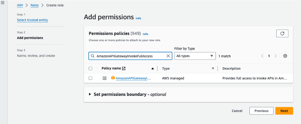 The trust relation example noted above with principal root could provide access to more principals than intended. The Principal and Condition elements can be used to restrict access to the role for specific principals. For more information, see How to use trust policies with IAM roles. You can also create this role in one AWS account and delegate specific permissions to another account using cross-account access. To define a trust policy with cross-account access, see the examples provided here.Add the Amazon APIGatewayInvokeFullAccess permission policy to invoke APIs. Click here for more information.