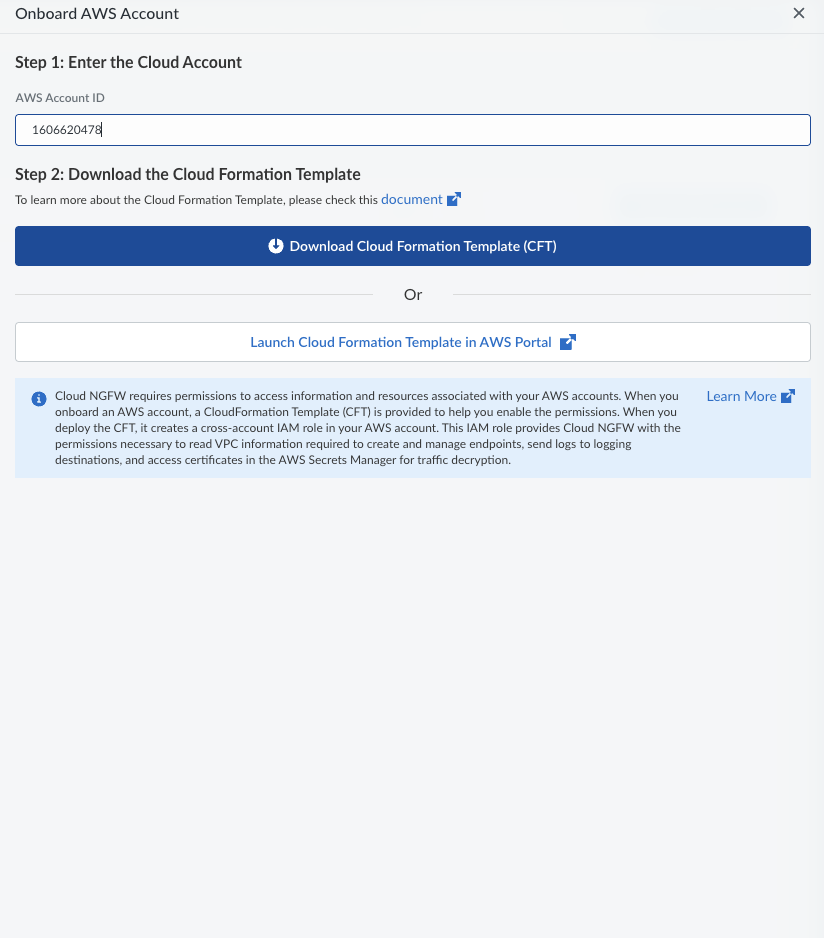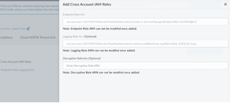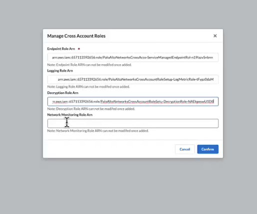 In Step 2: Download the Cloud Formation Template, click Download Cloud Formation Template (CFT) or Launch Cloud Formation Template in AWS Portal. This template helps you to create the necessary cross-account IAM roles in your AWS account. The roles provide SCM with the permissions to read VPC information, create and manage endpoints, and send logs.Go to your AWS account and deploy the CFT to create the required roles:Logging Role, Endpoint Role, Network Monitoring Role, and Decryption Role . For more information, see Create Cloud NGFW for AWS EndpointsOnce the roles are created in your AWS account, copy the Amazon Resource Names (ARNs) for each role.Return to the SCM UI. In the Add Cross Account IAM Roles section, manually enter the copied ARNs for each of the four roles.