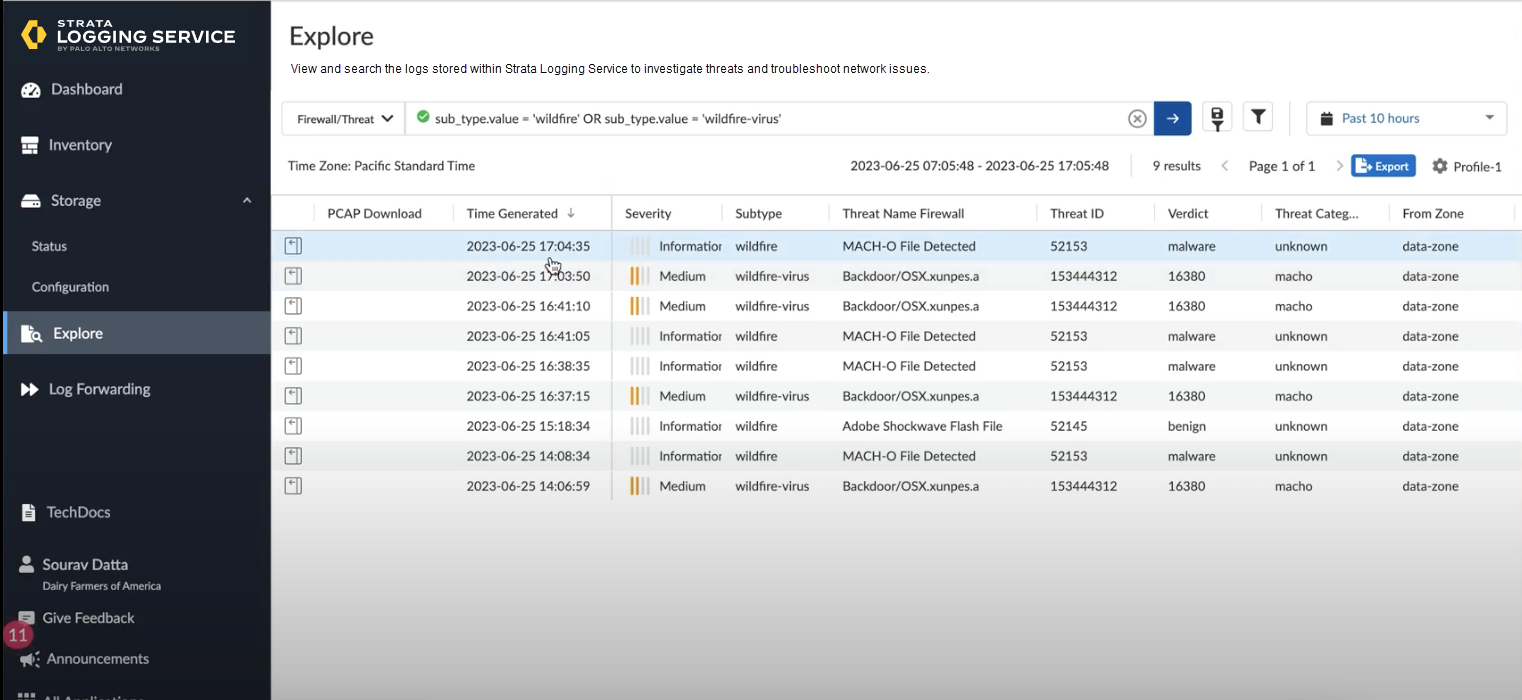 You can also view WildFire logs in your Strata Logging Service instance.- Click Explore and select Firewall/Threat from the explore drop-down.