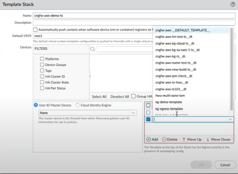 - Add a cloud device group using the Panorama console.Panorama > Templates, and select your Template StackThe AWS plugin associates the template stack with your cloud device group. The AWS plugin creates a default template and adds the Public and Private zones to this template by default.In the Templates section, you can see the default template created by the AWS plugin that will have the same name as your template stack with a suffix __dt appended to its name.