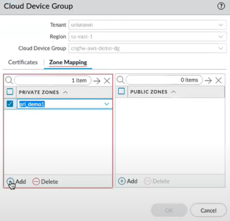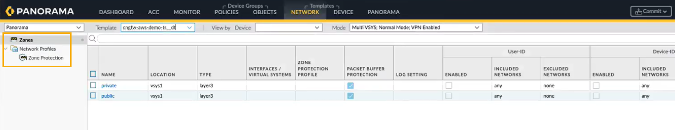 Click Public and select the Zone Protection Profile for your Public zone.Navigate back to your cloud device group. Go to the Zone Mapping tab.You can see the list of Panorama templates that you have referenced to the template stack list. You can map the Panorama zones to the default Private and Public zones that are created by the AWS plugin.