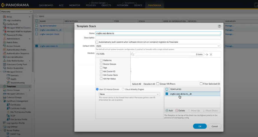 Panorama Cloud NGFW template stacks and templates, the web interface to configure