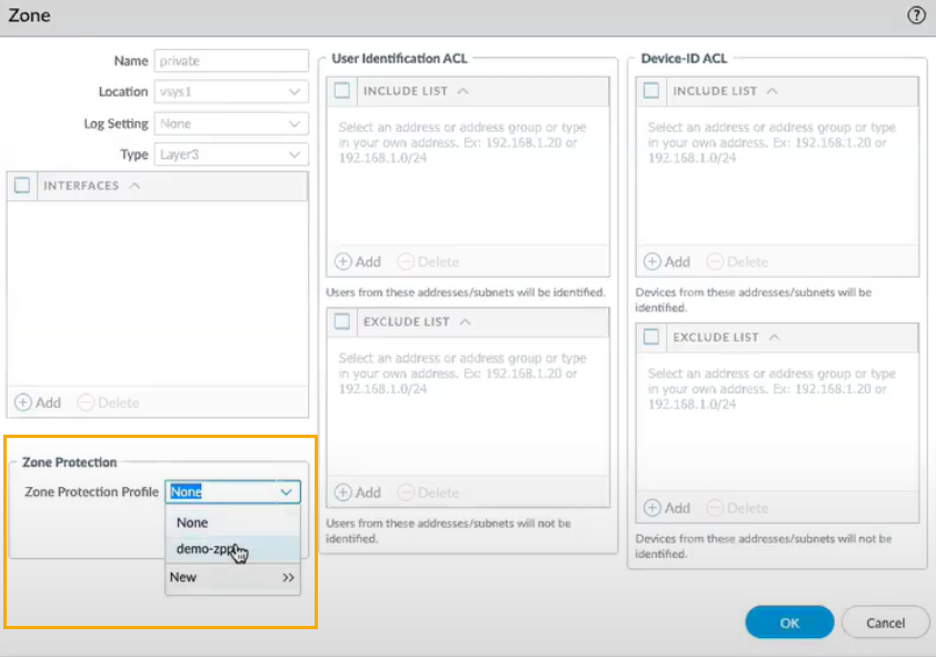 Click Private and select the Zone Protection Profile for your Private Zone.