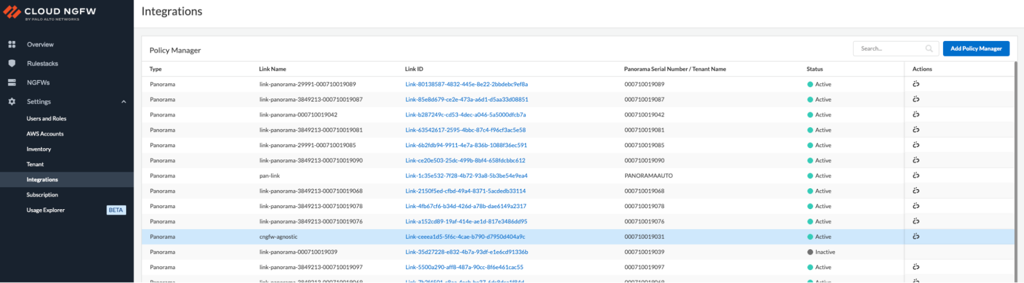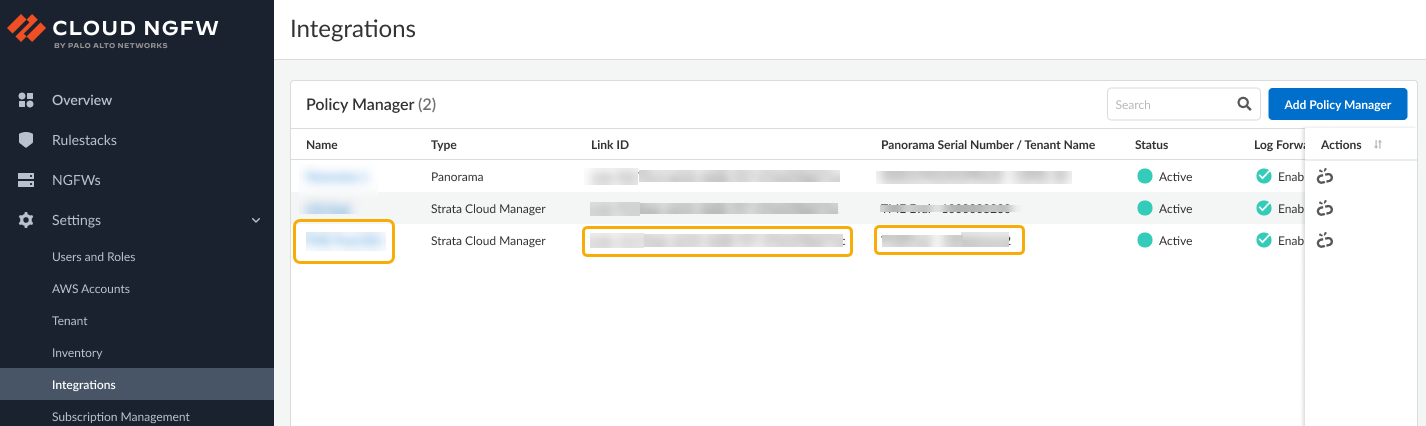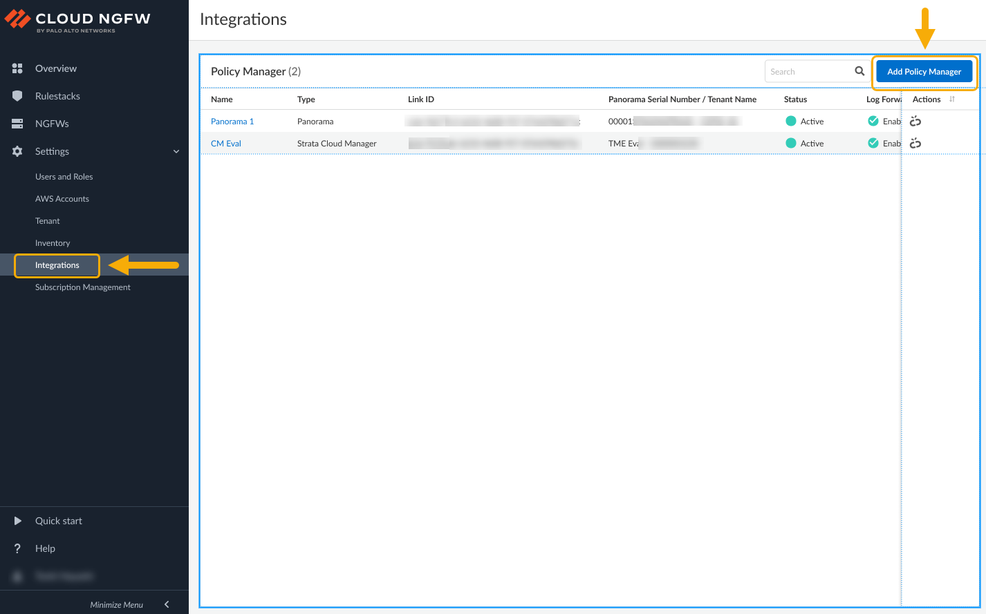 - Log in to the Cloud NGFW console.Select Integrations.In the Policy Manager screen, click Add Policy Manager.