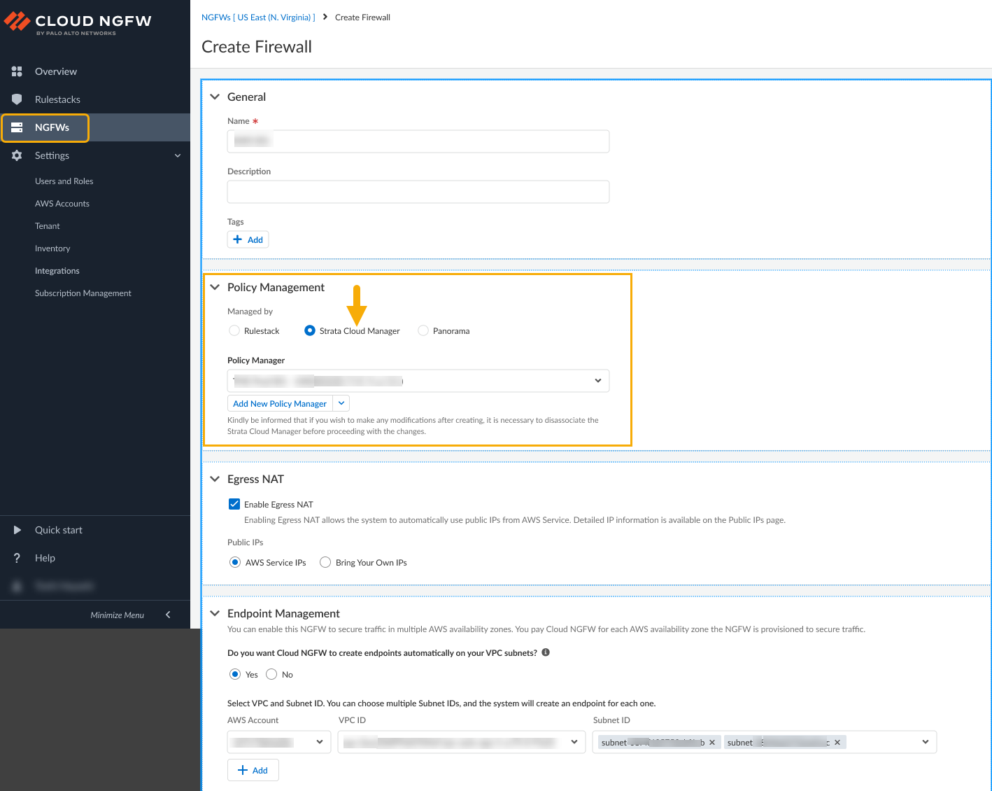 In the Create Firewall screen, enter a name for the firewall.Optionally include a description.In the Policy Management section, select Strata Cloud Manager.