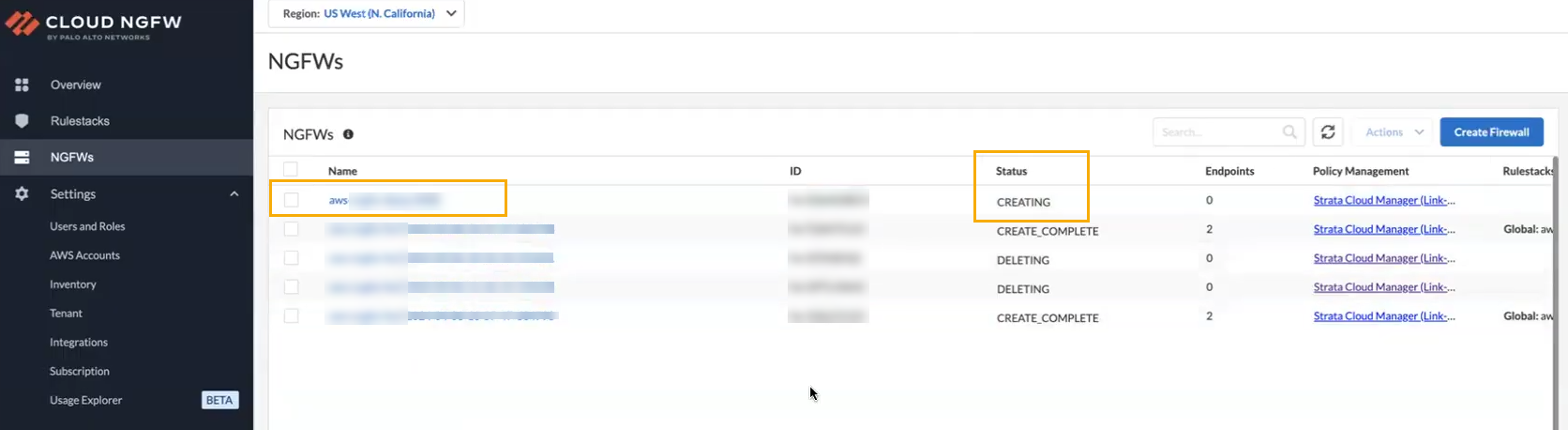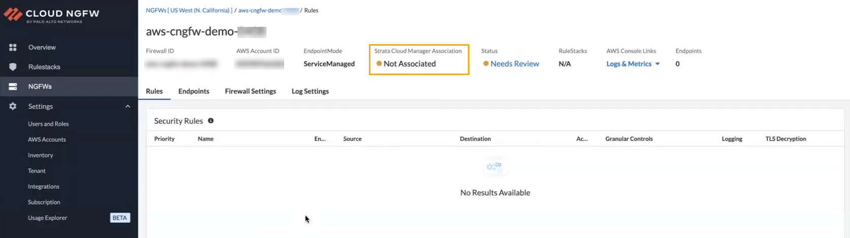 Configure Endpoint Management to secure traffic in multiple AWS availability zones.- Determine if you want Cloud NGFW to create endpoints automatically on your VPC subnets. Select Yes for service-managed endpoints.By default, the Cloud NGFW resource does not automatically create these endpoints; the radio button is set to No.Use the drop-down to select the AWS Account ID.Use the drop-down to select the VPC.Use the Subnet field to select an available subnet.Click Save.The NGFW screen changes to reflect the newly created firewall. It takes approximately 6-10 minutes to complete the process of creating a new firewall; the Status indicates CREATING: