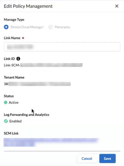 Enter a descriptive name.Use the drop-down menu to select the Strata Cloud Manager Tenant you want to associate with the resource.The Customer Support Portal (CSP) account must be the same for both SCM and CNGFW. If you do not have a Strata Cloud Manager, you can activate a new Strata Cloud Manager Essentials (steps 1-8) to use with Cloud NGFW. In either case, the integration automatically enables Strata Cloud Manager Pro features for Cloud NGFW.Click Save. This effectively links your Cloud NGFW resource to the SCM tenant.After saving the configuration the Integrations page is updated to reflect the new policy management paradigm, along with the associated Link ID and SCM Serial Number and Tenant Name: