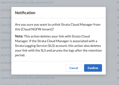 Click the Unlink icon to begin the unlinking process.When you unlink a SCM from your Cloud NGFW tenant, you may be prompted to delete one or more Cloud Device Groups that are associated with the Cloud NGFW resource or region from which you are unlinking. In such cases an error message appears stating if the SCM is associated with a SLS account the link with the SLS will be deleted.Confirm the unlinking process. If your SCM is associated with a Strata Logging Service account, that association is terminated and logs are pruned after the retention period.