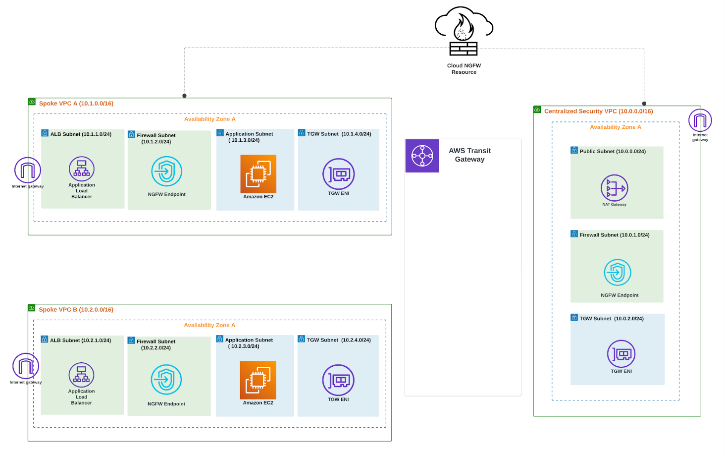 - cross account NGFW endpoints in the application VPCs provide the inbound traffic