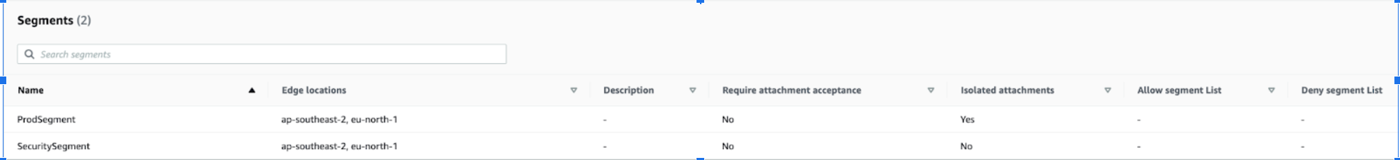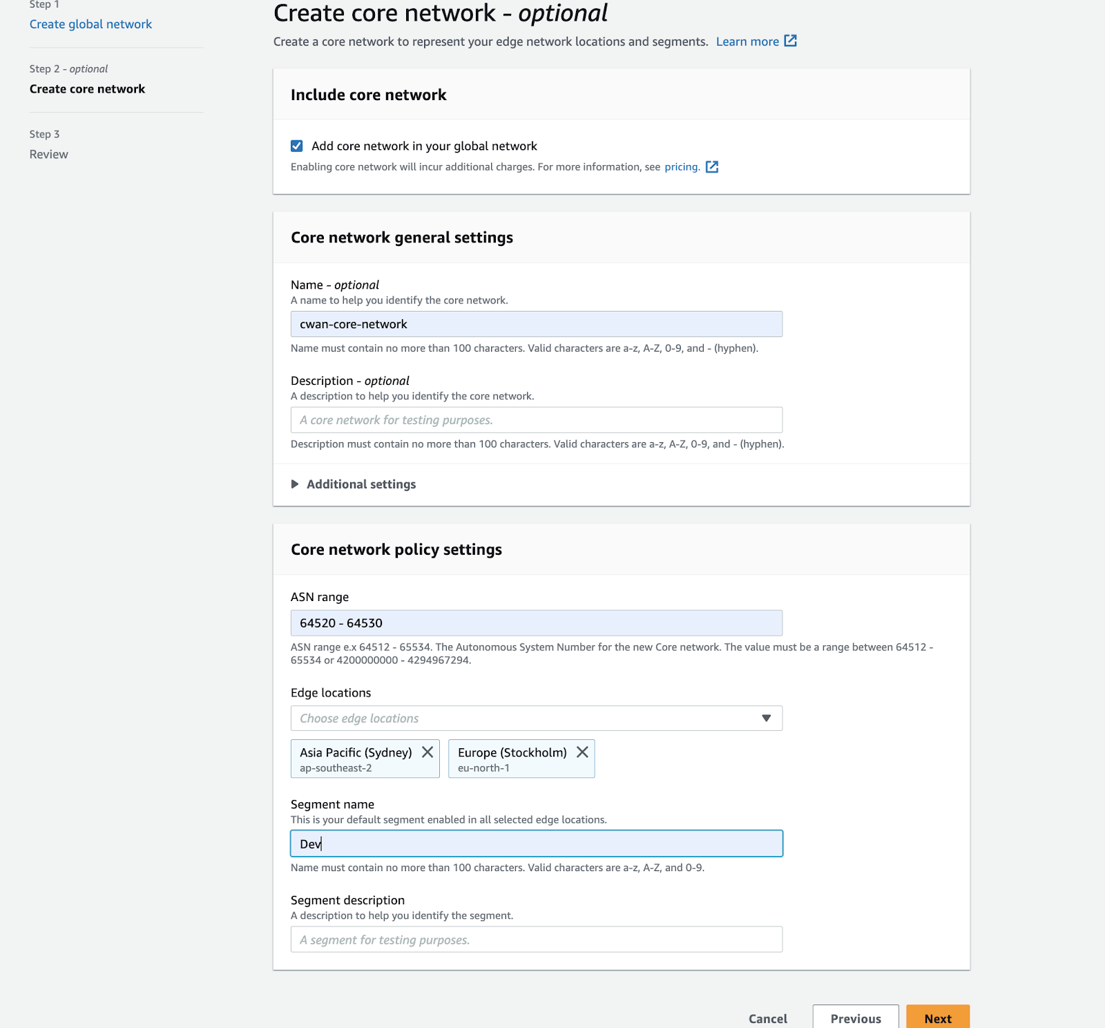 • While creating the core network, ensure that you add all the regions your VPCs are configured to, in the edge locations section under core network policy settings. You also need to create segments and add the type of segment (dev, prod, management, or security) that these regions belong to, under the segment name.