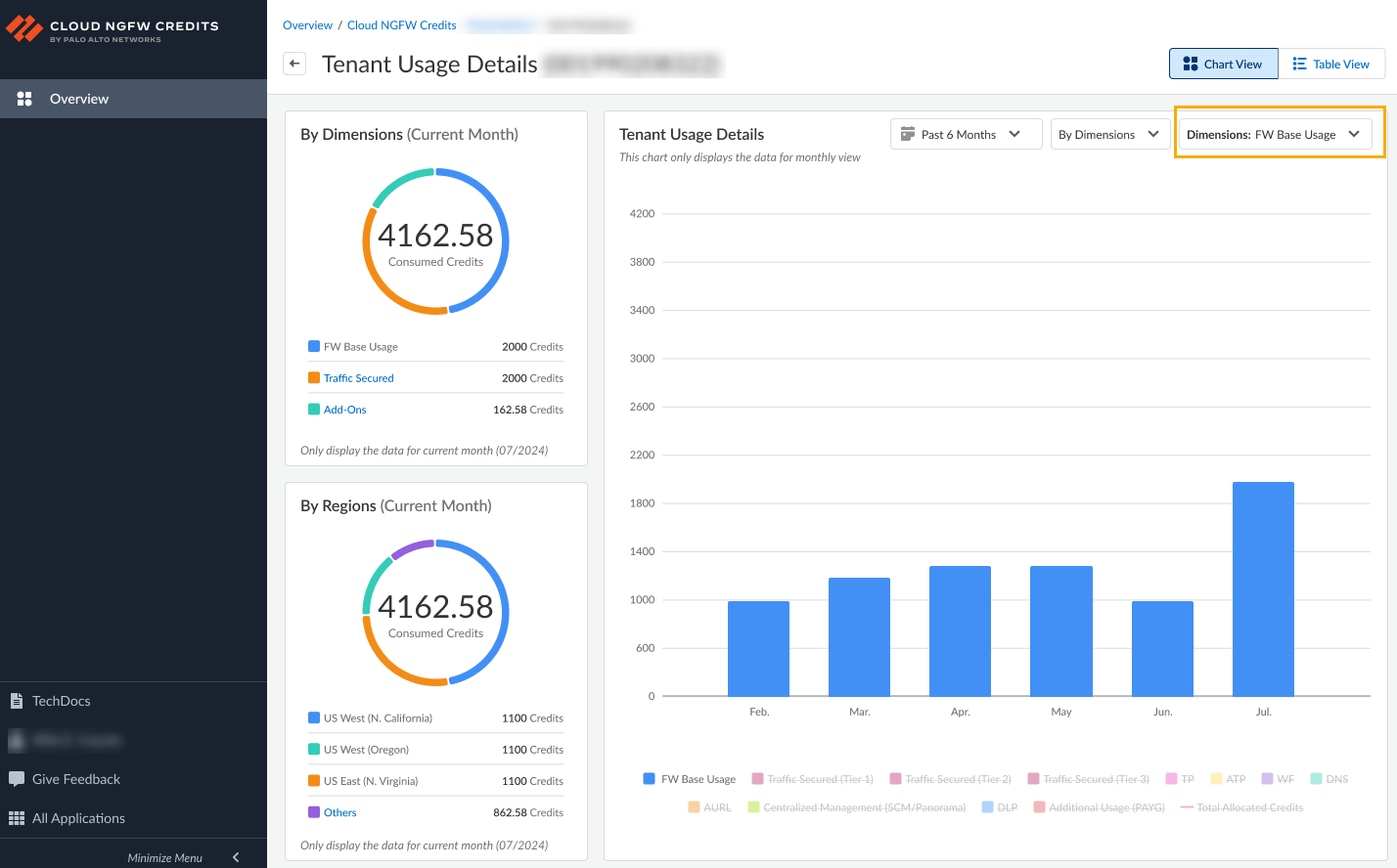 The Tenant Usage Details page displays information about how Cloud NGFW credits are consumed. When you first access this page a chart view provides a graphical representation of your credit consumption. You can change this view to a table view using the option in the upper right of the web interface.Tenant Usage Details Chart ViewTenant Usage Details Chart ViewThe chart view provides a color-coded graphical representation of usage details and is organized by base FW usage, traffic secured, and add-ons. This view includes credit usage based on base firewall, traffic secured and add-ons. Data can be filtered based on the usage type (monthly or daily views), a date range (past 15, 30 or 90 days, or you can customize the date range), region or dimension. When using the chart view, consider:- By default, the chart view display usage for the last 15 days.