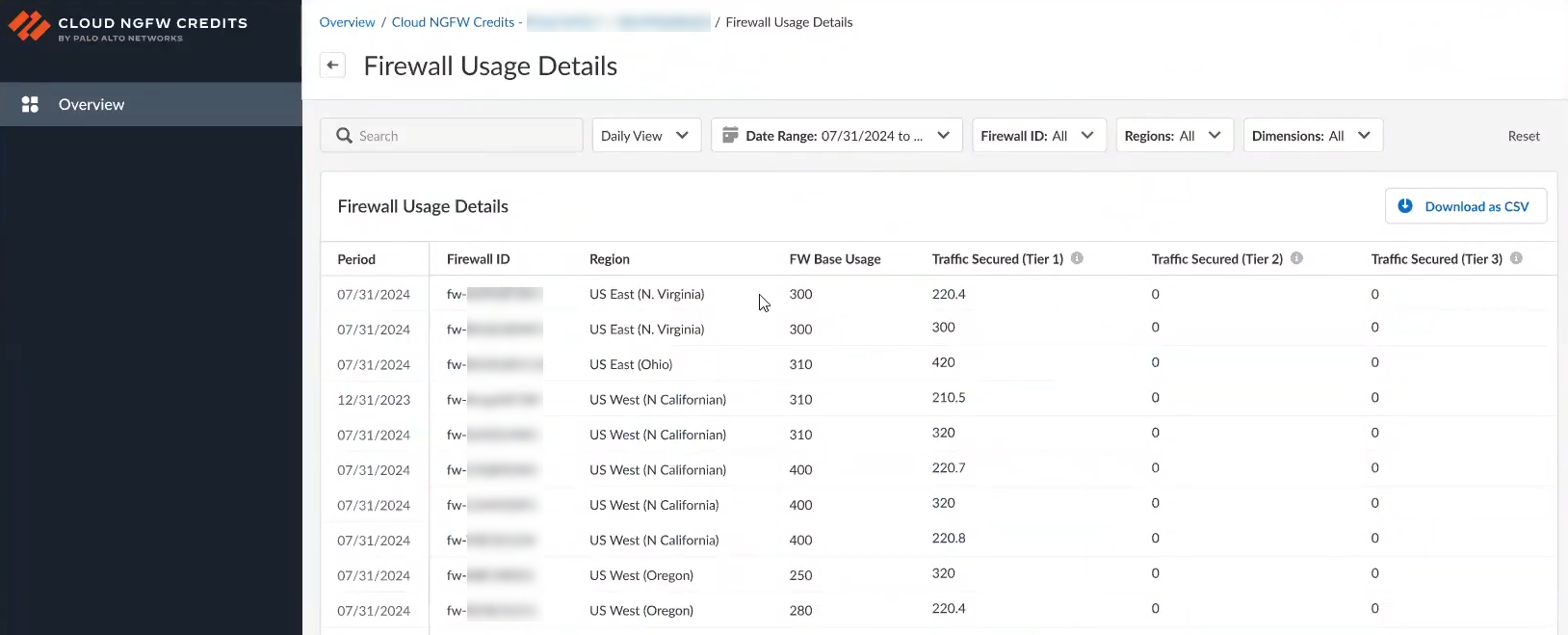 You can also display details for each firewall by selecting the link in the Total Consumed Credits (FW Usage). By default Firewall Usage Details are displayed in a daily view; you can use additional options to display these details in a specific date range, or, you can display them based on an individual firewall ID, by region, or by dimensions. Options include:- Period. The time frame for credit consumption.