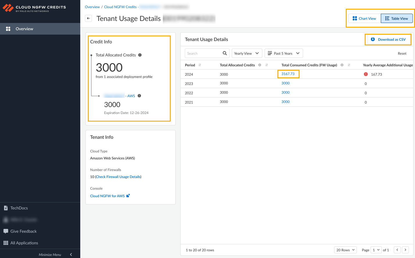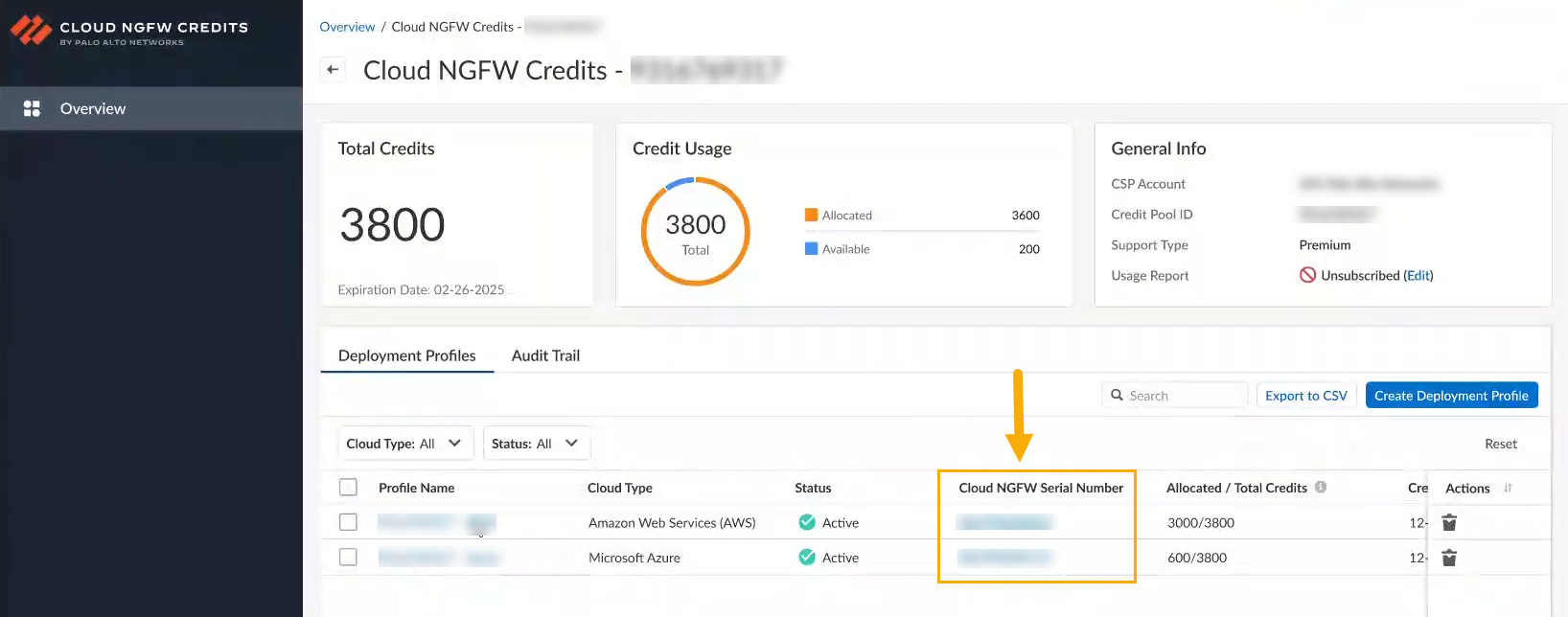 The Cloud NGFW Credits page provides access to credit visibility functionality. To access it, select the Cloud NGFW serial number associated with the deployment profile you want to view.The Cloud NGFW Credits page provides access to the credit visibility functionality. To access it, select the Credit Usage Details link next to the serial number associated with the deployment profile you want to view.