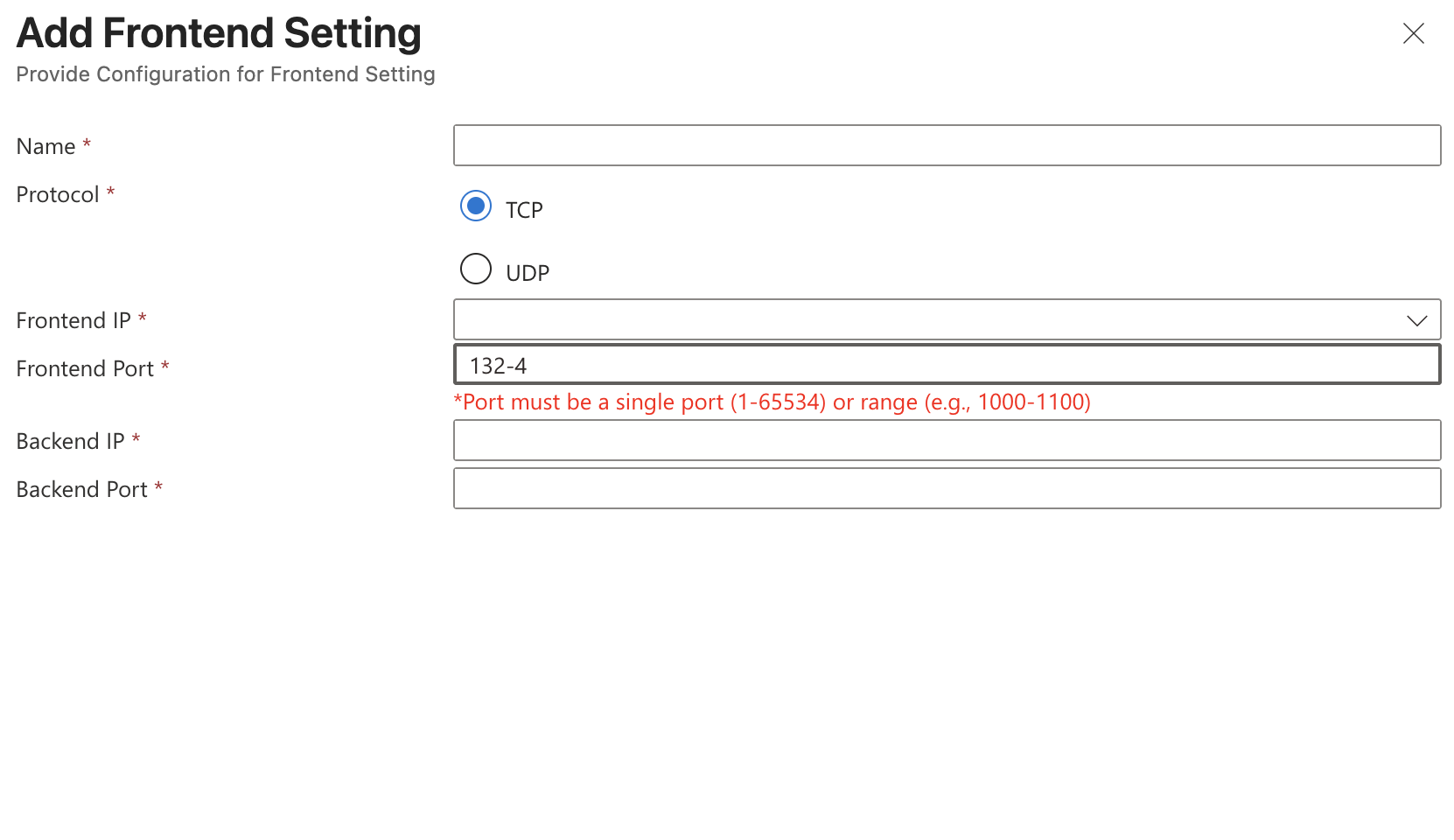 • You can enter either a single port or a range of ports for destination translation. The range defined for the Frontend Port must exactly match the range defined for the Backend Port. Mismatched ranges will result in a Bad Request error.