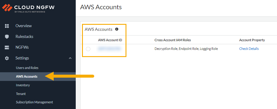 To create a support case using the Cloud NGFW console:- Locate your AWS Account ID. Select AWS Accounts.