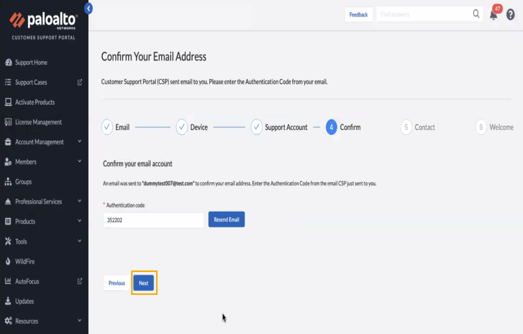 Confirm your email address for your Customer Support Portal account, then click Next.Verify your Contact Information. Select your Security Notification Subscriptions, then click Register Product