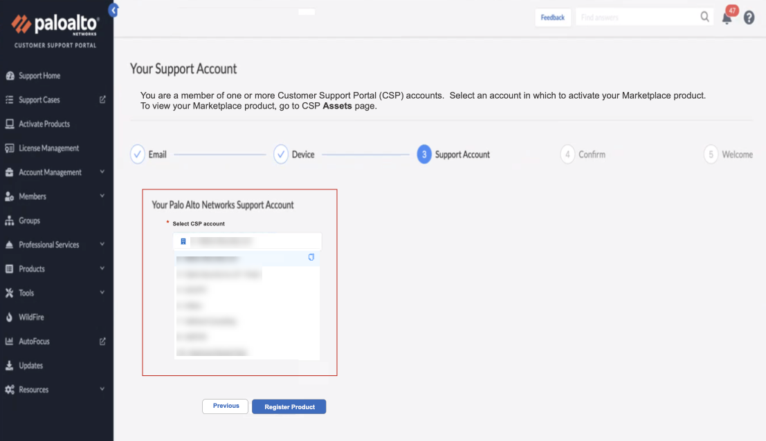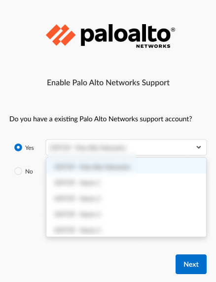 - Log in to the Cloud NGFW console.In the Enable Palo Alto Networks Support screen, select Yes.If you select No in the Enable Palo Alto Networks screen, you’ll need to use the Customer Support Portal (CSP) to register your Cloud NGFW tenant, or use the Cloud NGFW console to register with the CSP.Use the drop-down menu to select the support account.Click Next.