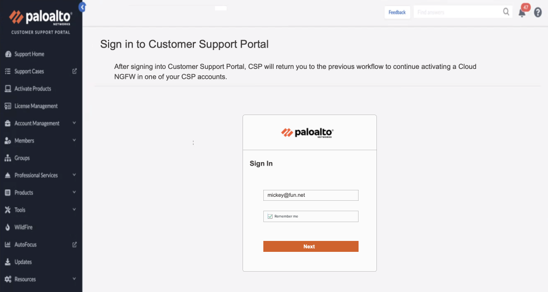 You can use the Customer Support Portal to register your Cloud NGFW tenant.You will need an account to log into the CSP. See create a Customer Support account for more information.- In the Customer Support Portal, enter your login credentials, then click Next.