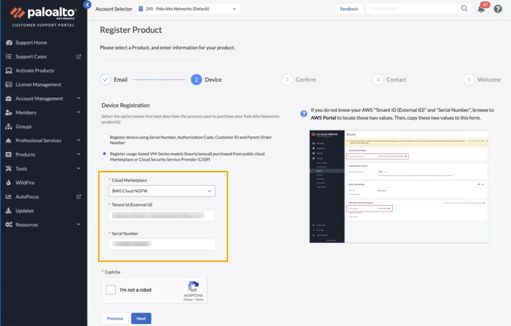 On the Register Product page in the Customer Support Portal, use the drop-down menu to select AWS Cloud NGFW for the Cloud Marketplace. Enter the Tenant ID and Serial Number and resolve the Captcha.Click Next.