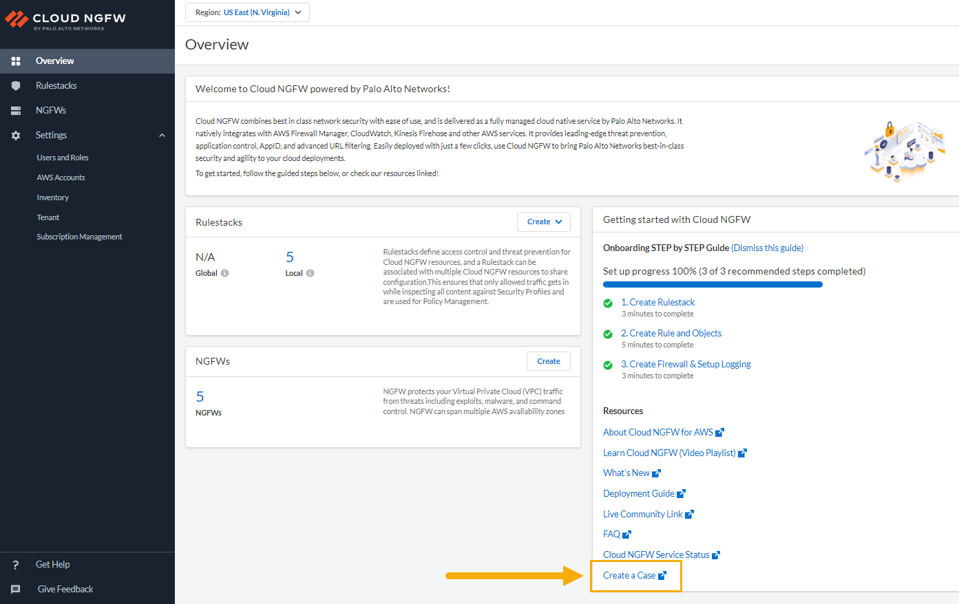 On the Overview page in the Cloud NGFW console, click Create a case.