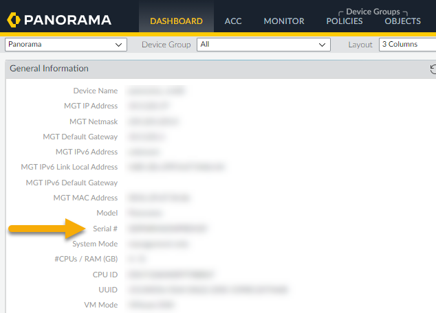 If required, use the Panorama console to determine additional information for the support case, like the tenant ID, or the Panorama serial number.Locate the Panorama serial number using the Dashboard: