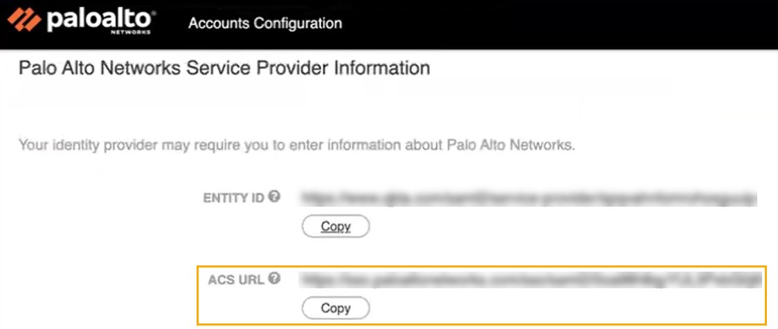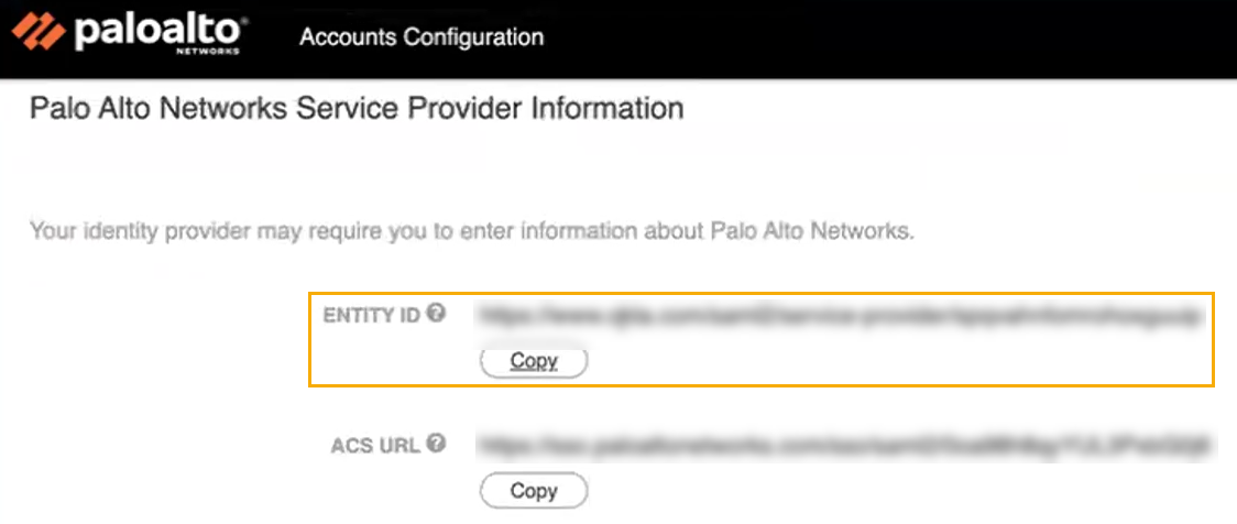 The Accounts Configuration page changes to display Palo Alto Service Provider Information. Copy the Entity ID URL.
