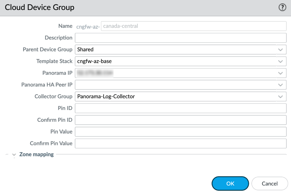 The Cloud Device Group must have the log collector Group selected before deploying the Cloud NGFW; you can't perform this task after deploying your Cloud NGFW.