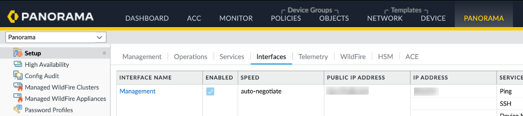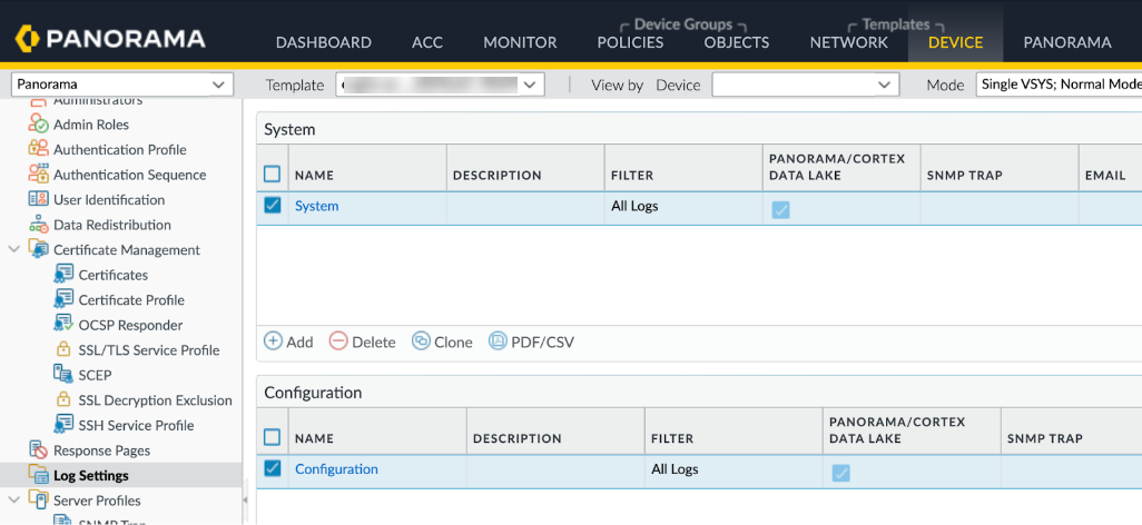 When using Panorama for policy management and log collection, consider that the Cloud NGFW connects to Panorama using a private IP address. If you have configured a public IP address on the management node the log collector uses the public IP address. For more information about this behavior, refer to this knowledge base article in the Customer Support Portal.If you intend to use Panorama to collect system-level logs, configure the Log Settings under the device template:
